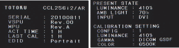 Fabryczne menu monitora OSD | Numer katalogowy, numer seryjny, całkowity czas świecenia, ustawienia kalibracji (czas świecenia od ostatniej kalibracji, luminancja, gamma , etc.), aktualna luminancja, etc. | |