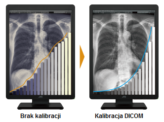 Fabryczne menu monitora OSD Numer katalogowy, numer seryjny, całkowity czas świecenia, ustawienia kalibracji (czas świecenia od ostatniej kalibracji, luminancja, gamma , etc.), aktualna luminancja, temperatura barwowa i jasność otoczenia, zgodność z DICOM.