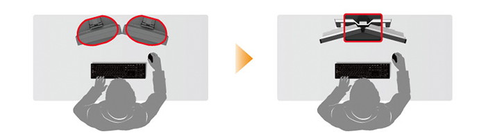 Powierzchnia podstawy statywu podwójnego jest o 46% mniejsza w porównaniu z powierzchnią podstaw dwóch statywów pojedynczych. Zaoszczędzone w ten sposób miejsce można wykorzystać zwiększając przestrzeń roboczą obok monitorów.