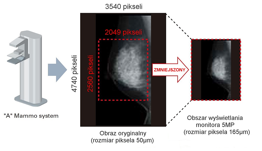 Po uzyskaniu obrazu z urządzenia diagnostycznego jego natywna rozdzielczość jest wyższa niż rozdzielczość możliwa do wyświetlenia na monitorze. W konsekwencji w celu wyświetlenia takiego obrazu na dostępnych obecnie monitorach konieczne jest wykonanie jednej z dwóch możliwych operacji. Pierwszą z nich jest konwersja obrazu oryginalnego do obrazu o niższej rozdzielczości, wynikiem czego jest obniżenie jakości obrazu (konwersja ta wykonywana jest przez oprogramowanie do przeglądania obrazów, konwersja stratna). Drugą możliwością jest wyświetlenie tylko części zapisanego obrazu oryginalnego z zachowaniem jego rozdzielczości. Rysunek 1. pokazuje pierwszy sposób wyświetlania obrazu oryginalnego na monitorze. W tej metodzie wyświetlanych jest tylko 31% informacji zawartych w obrazie oryginalnym.