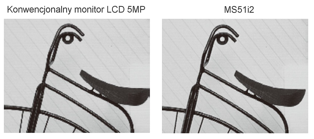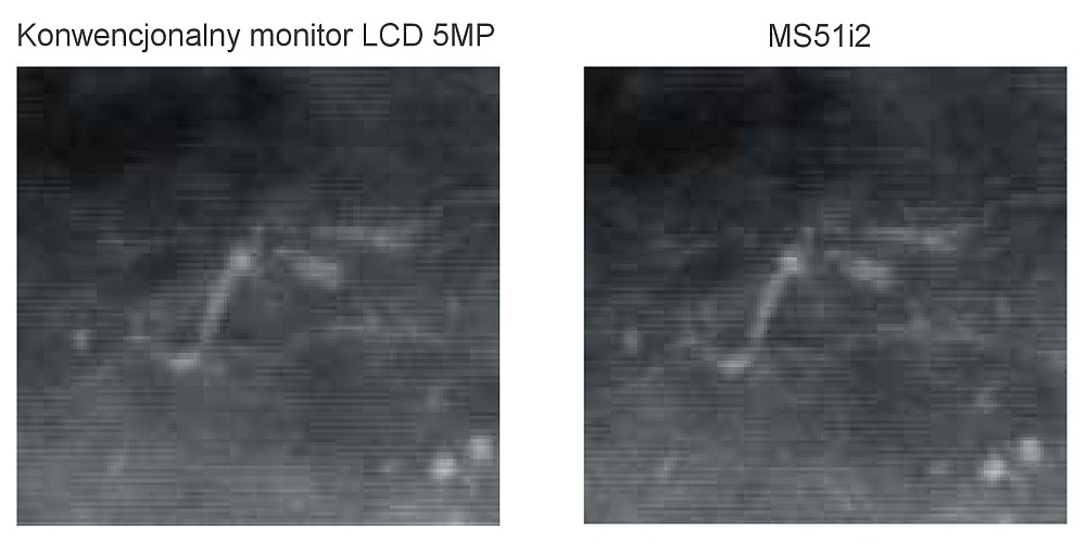 Rysunek 4. Porównanie obrazów uzyskanych z konwencjonalnego monitora LCD 5MP i z monitora MS53i2 z technologia ISD,