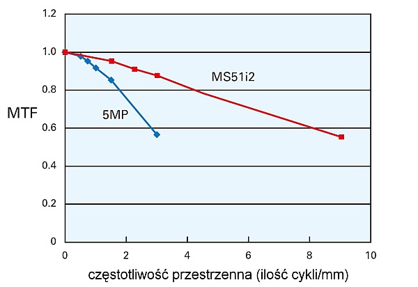 Rysunek 5. Zmierzone krzywe MTFs w kierunku poziomym (w osi ułożenia subpikseli) dla monitora MS53i2 i konwencjonalnego monitora LCD 5MP.