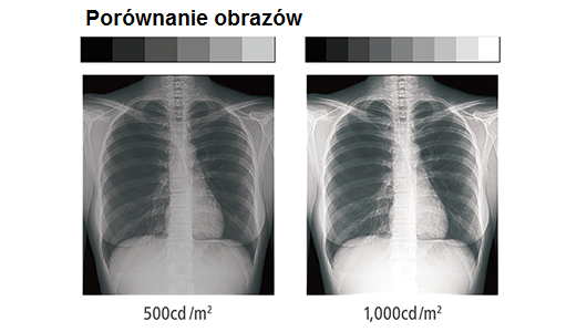 Monitor MS-S300 jest fabrycznie kalibrowany do jasności 1000 cd / m2, co czyni go najlepszym narzędziem do oglądania obrazów RTG i CR/MR. Wysoka jasność ekranu monitora radykalnie zwiększa ilość wyświetlanych odcieni szarości, dzięki czemu widoczność poszczególnych struktur staje się dużo większa.