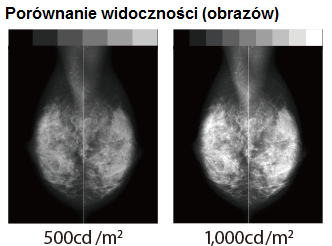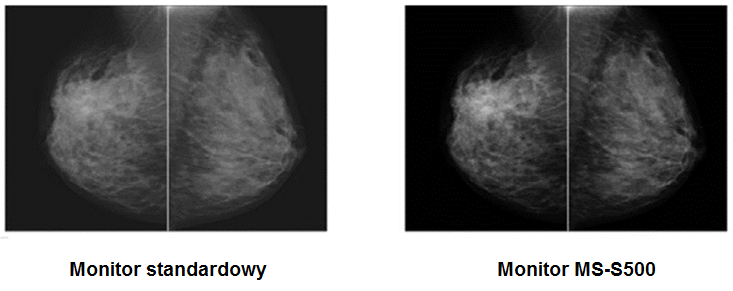 Monitor MS-S500 jest fabrycznie kalibrowany do jasności 1000 cd / m2, co czyni go najlepszym rozwiązaniem do ogladania obrazów piersi. Wysoka jasność ekranu monitora radykalnie zwiększa ilość widzianych odcieni szarości, dzięki czemu wykrywalność mikrozwapnień i guzów jest dużo większa.