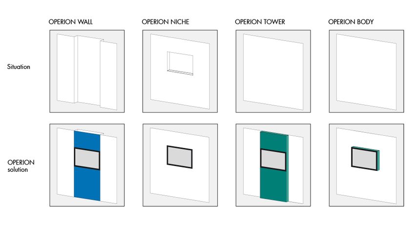 VIEWMEDIC OPERION można zainstalować w różnych wariantach (patrz powyższe rysunki), na lub w ścianie. Uwarunkowania przestrzenne, takie jak istniejące nisze lub stare kasetony mogą zostać dzięki temu w pełni wykorzystane. Ułatwia to projektowanie sal operacyjnych, oferując większą elastyczność i nowe możliwości aranżacji przestrzeni.