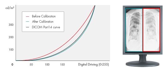 Funkcja kalibracji kolorów umożliwia wierną reprodukcje kolorów oraz wyświetlanie odcieni szarości zgodnie z DICOM cześć 14. Poprzez kalibrację temperatury barwowej, luminancji i krzywej gamma reprodukcja kolorów jest wierna oryginałowi, a przejścia między odcieniami szarości są realizowane w sposób płynny.