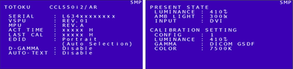 Fabryczne menu monitora OSD | Numer katalogowy, numer seryjny, całkowity czas świecenia, ustawienia kalibracji (czas świecenia od ostatniej kalibracji, luminancja, gamma , etc.), aktualna luminancja, etc. | |