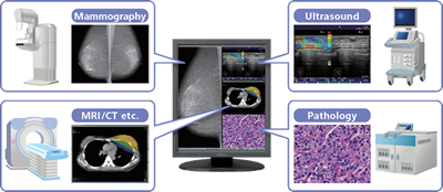 Kolorowy monitor o wysokiej rozdzielczości przeznaczony do mammografii z dynamicznym dopasowaniem krzywych odwzorowania (Tryb Dynamiczny).