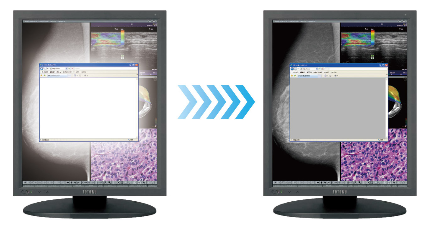 Wysoka jasność monitorów medycznych jest konieczna do prawidłowego wyświetlenia obrazów diagnostycznych. Ale tak wysoka jasność przynosi nie tylko korzyści. Może być ona utrudnieniem przy pisaniu tekstów lub pracy z worklistą. Wynika to z faktu, że okna robocze Windows zawierają duże białe obszary, które oślepiają oczy użytkownika. Taka sytuacja ma wpływ na ocenę opisywanych zdjęć, ponieważ oko użytkownika musi odpocząć po chwilowym oślepieniu i ponownie zaadoptować się do obrazu diagnostycznego. Z tego powodu TOTOKU opracowało w swoich monitorach Tryb Tekstowy (ang.: AutoText Mode), który automatycznie wykrywa białe przeszkadzające w pracy obszary i zmniejsza jasność podświetlenia monitora na czas pracy z tekstem lub z worklistą. Poprzez zastosowanie tej funkcji obszar tekstowy jest przyjazny dla oka i nie oślepia użytkownika. Podobnie jak Tryb Dynamiczny rozwiązanie to działa od razu, od pierwszego uruchomienia monitora i nie wymaga od użytkownika żadnych wstępnych ustawień.