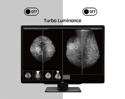 Funkcja Turbo Luminance podnosi na 30 sekund jasność i kontrast ekranu do maksimum, zwiększając tym samym widoczność poszczególnych odcieni szarości i ułatwiając wykrywanie na obrazach mammograficznych zmian o niskim kontraście.